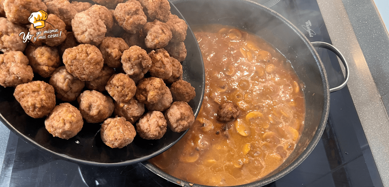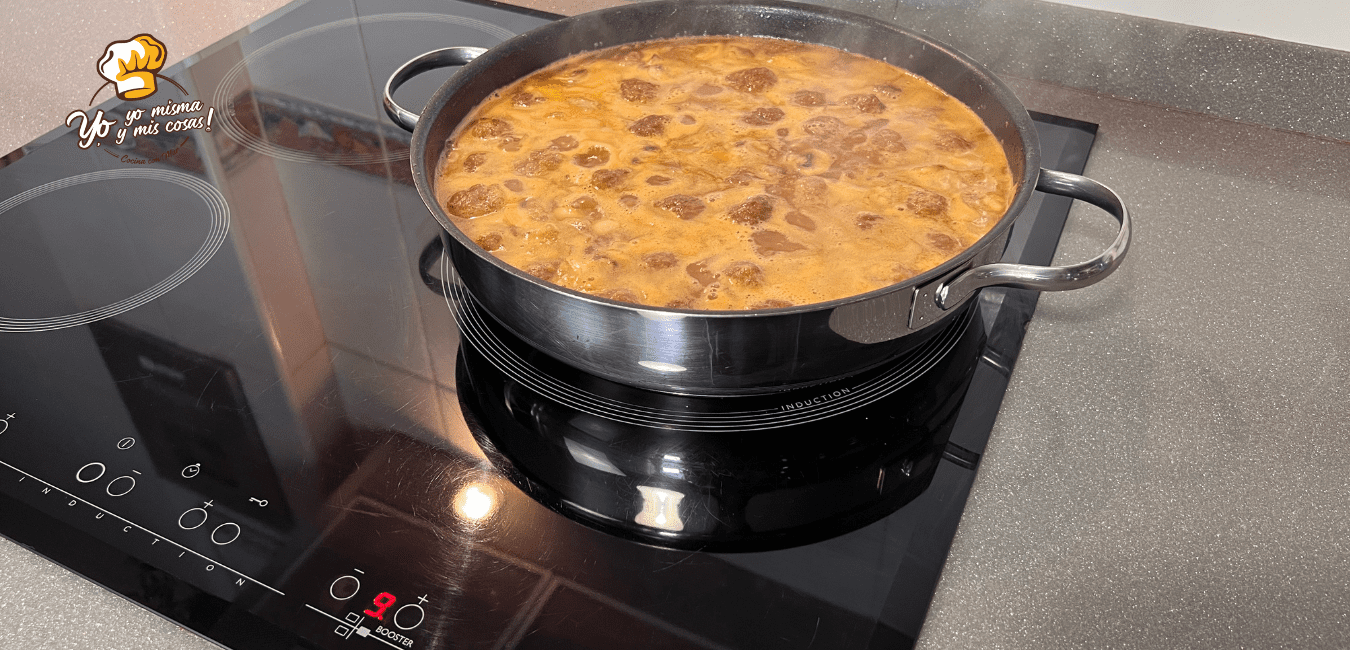 Añadimos las albóndigas y cubrimos con el caldo. Aproximadamente he añadido un litro de caldo.