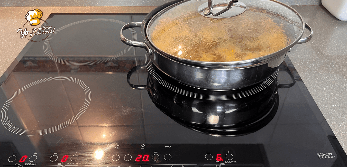 Subimos a fuego fuerte hasta que rompa el hervor. En ese momento bajamos a fuego medio y colocamos una tapadera a medio poner. Cocinamos 20 minutos.
