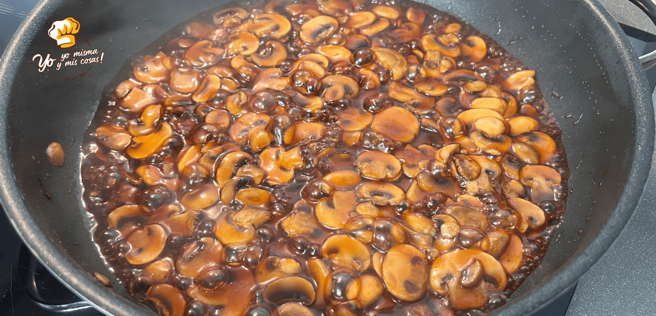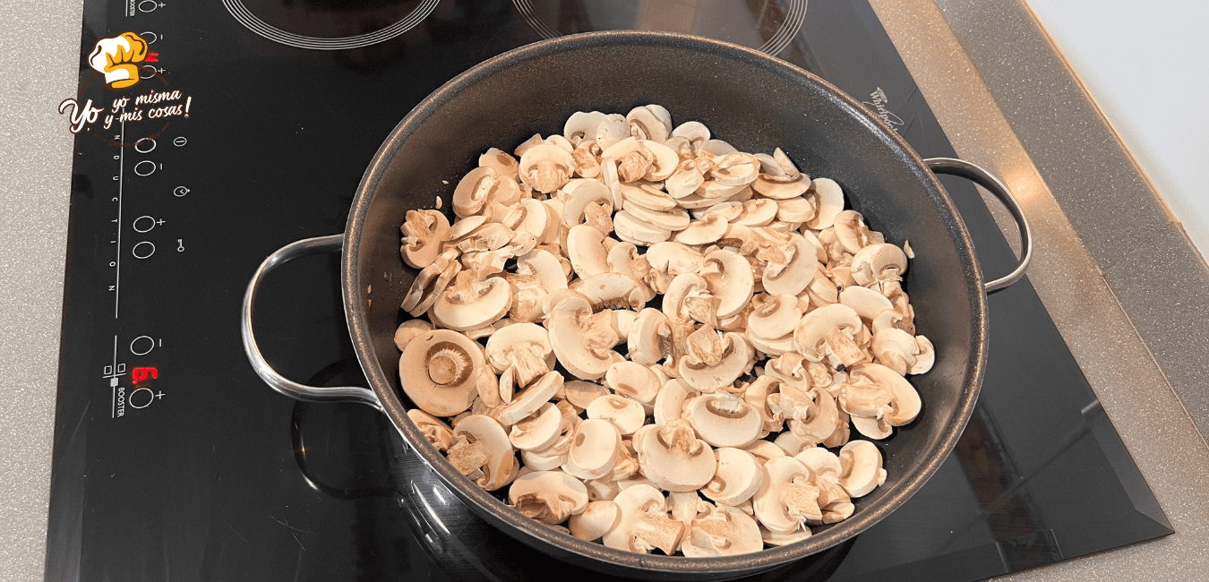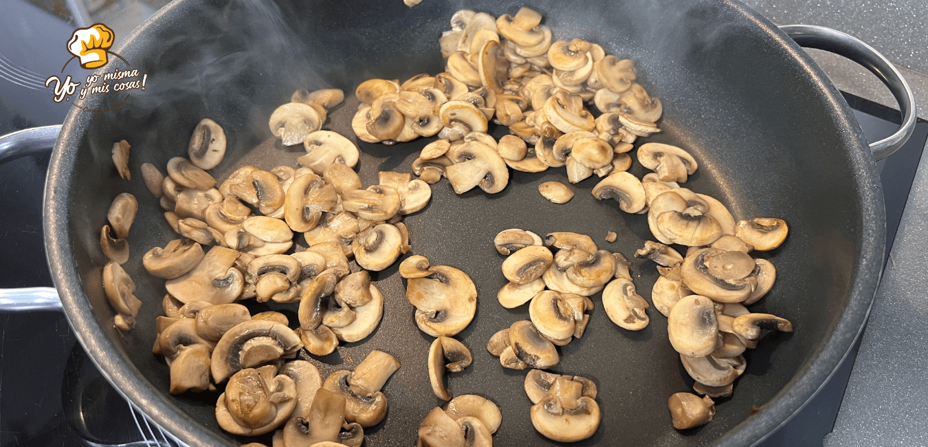 En la misma cazuela u olla echamos los champiñones y cocinamos a fuego medio hasta que pierdan su tamaño y tomen color.