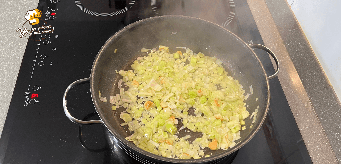 A un fuego medio cocinamos. Añadimos los dientes de ajo y comenzamos a dorar.