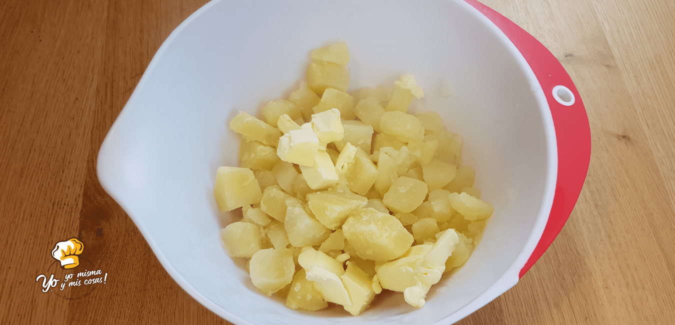 Las echamos las patatas en un recipiente y añadimos la mantequilla en taquitos.
