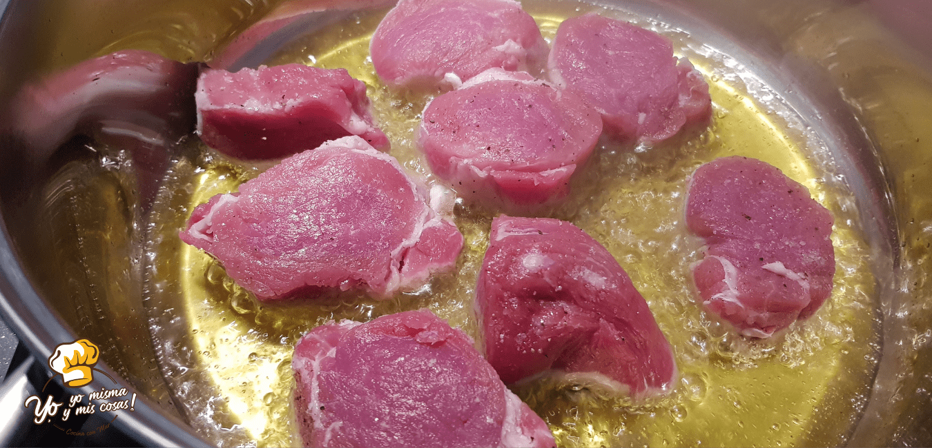 Lo primero será cortar el solomillo en medallones y salpimentarlos. Ponemos una sartén u olla con aceite de oliva a calentar. Doramos la carne a fuego fuerte. Para que se dore por fuera y quede cruda por dentro. Reservamos.
