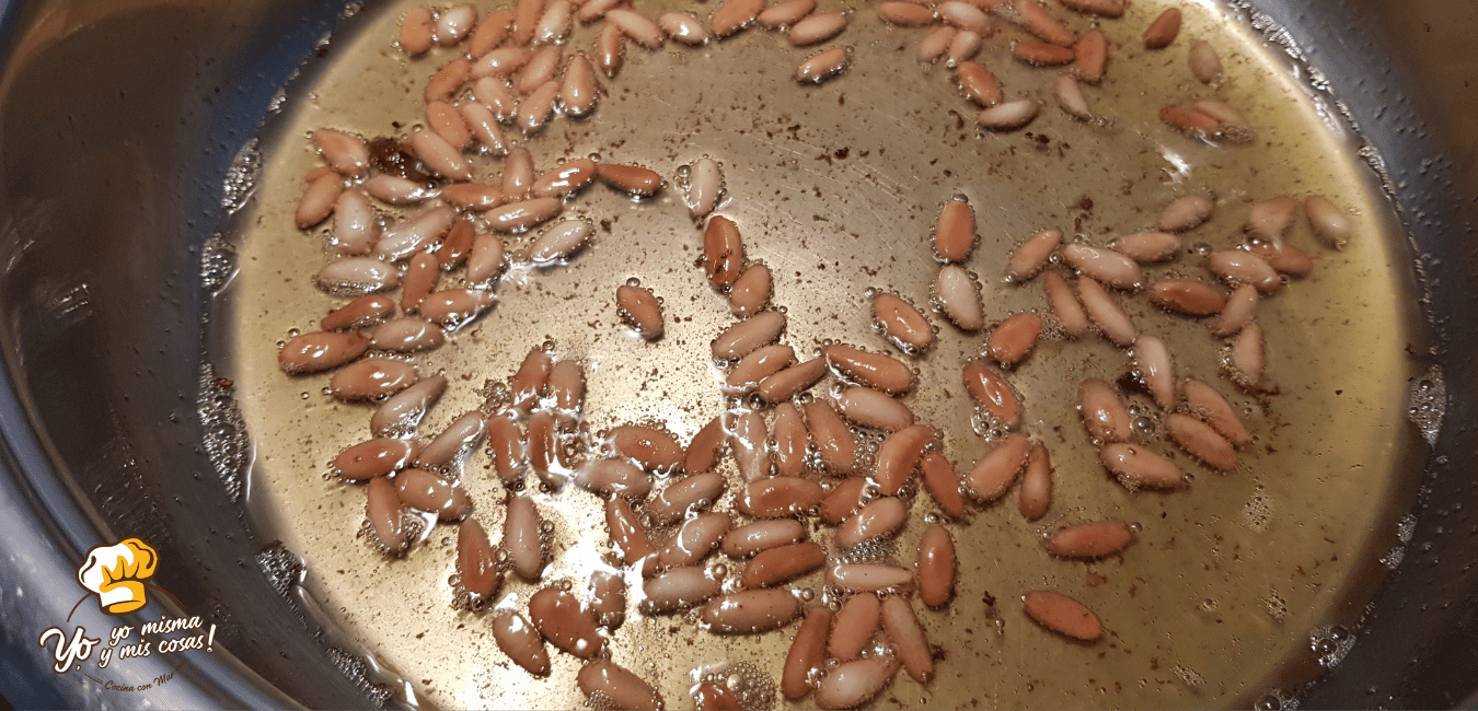 Colamos el aceite y lo ponemos nuevamente al fuego y tostamos los piñones. Reservamos.