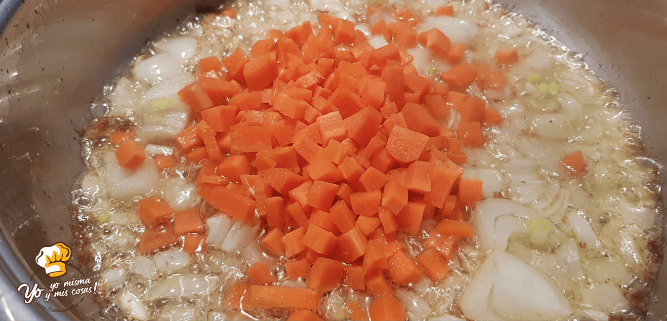 Ahora picaremos la cebolla y la zanahoria y pochamos. Cuando esté doradita y vencida la verdura echamos dos cucharadas de harina de trigo y tostamos un poco. Echamos en el vaso de la batidora y batimos la verdura y la harina.