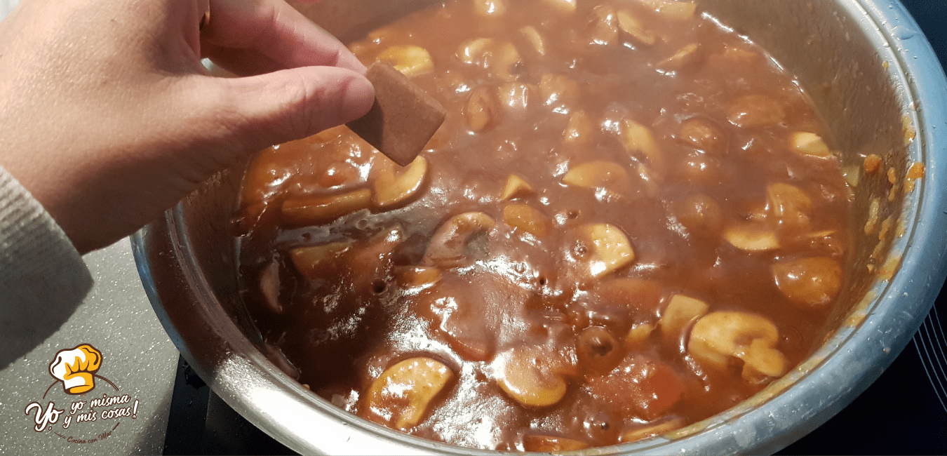 Seguidamente echamos el medio vaso de vino Pedro Ximenez. Subimos el fuego para que evapore bien el alcohol. Bajamos el fuego y añadimos la pastilla de caldo y dos vasos de agua.
