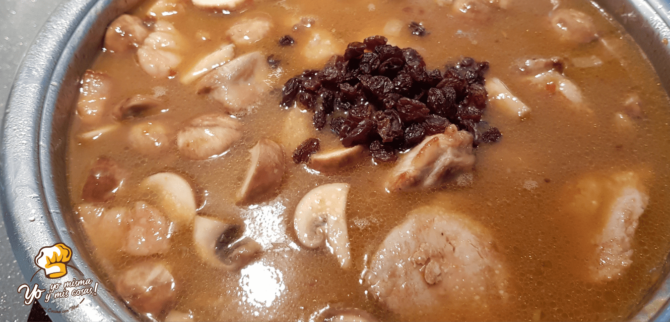 Dejamos unos 3 o 4 minutos a fuego medio y añadimos los medallones de solomillo, las pasas y los piñones. Rectificamos de sal y dejamos unos 30 minutos a fuego medio.