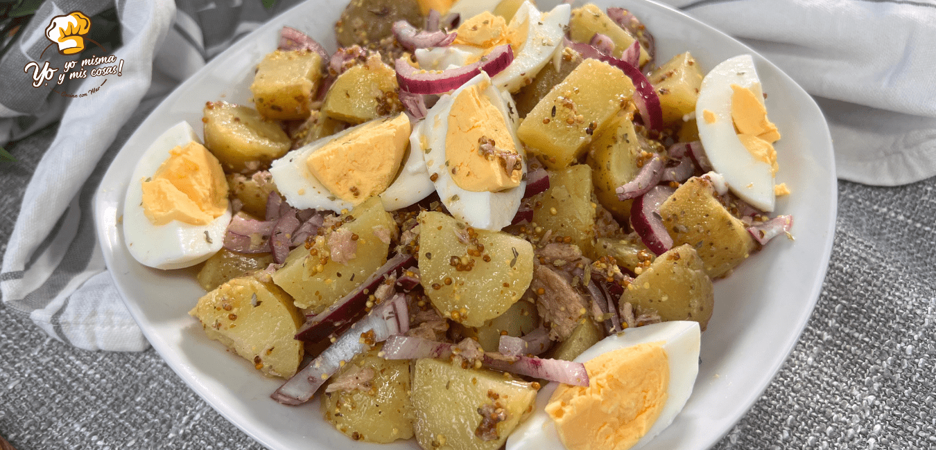 Es una ensalada con una vinagreta con mostaza muy sutil y rica. Le aporta un sabor muy rico. Y además es diferente. Os la recomiendo