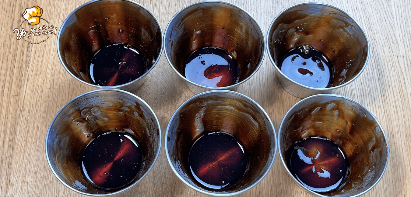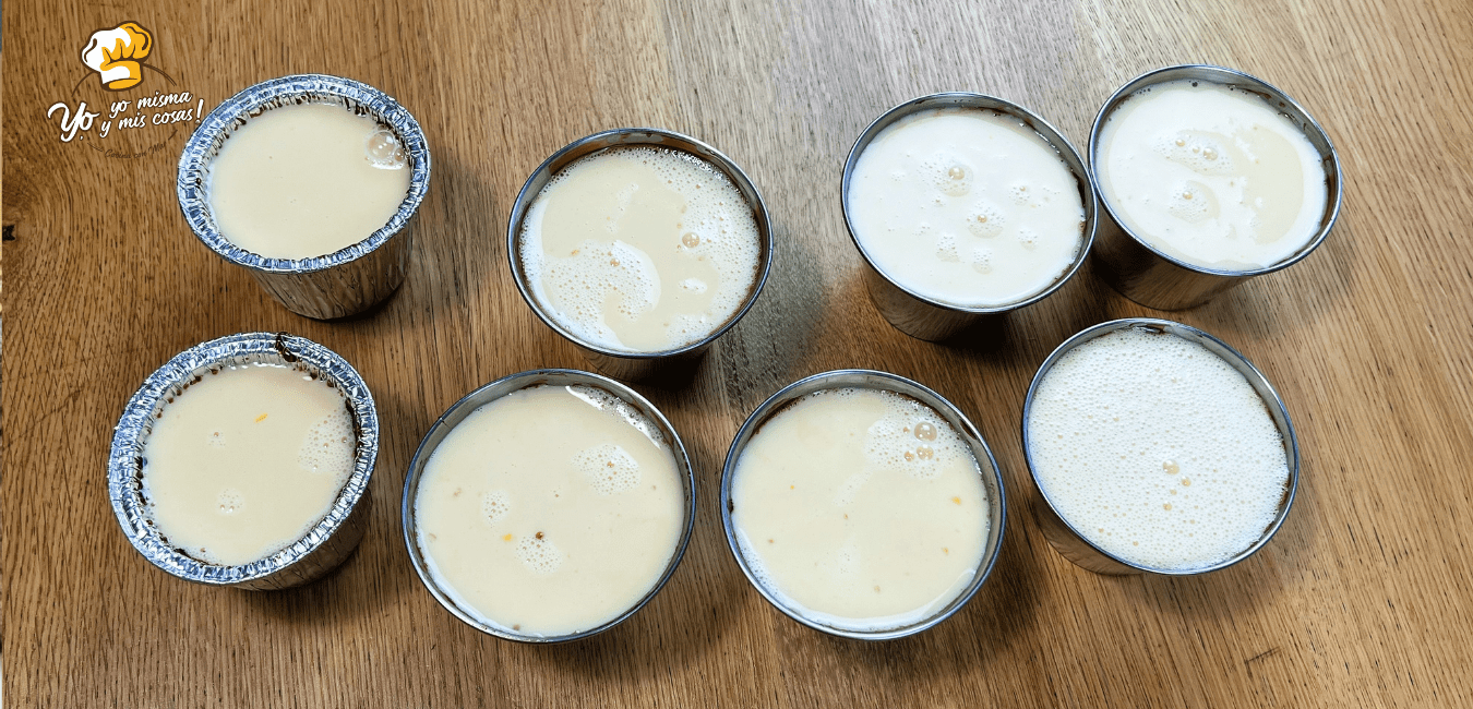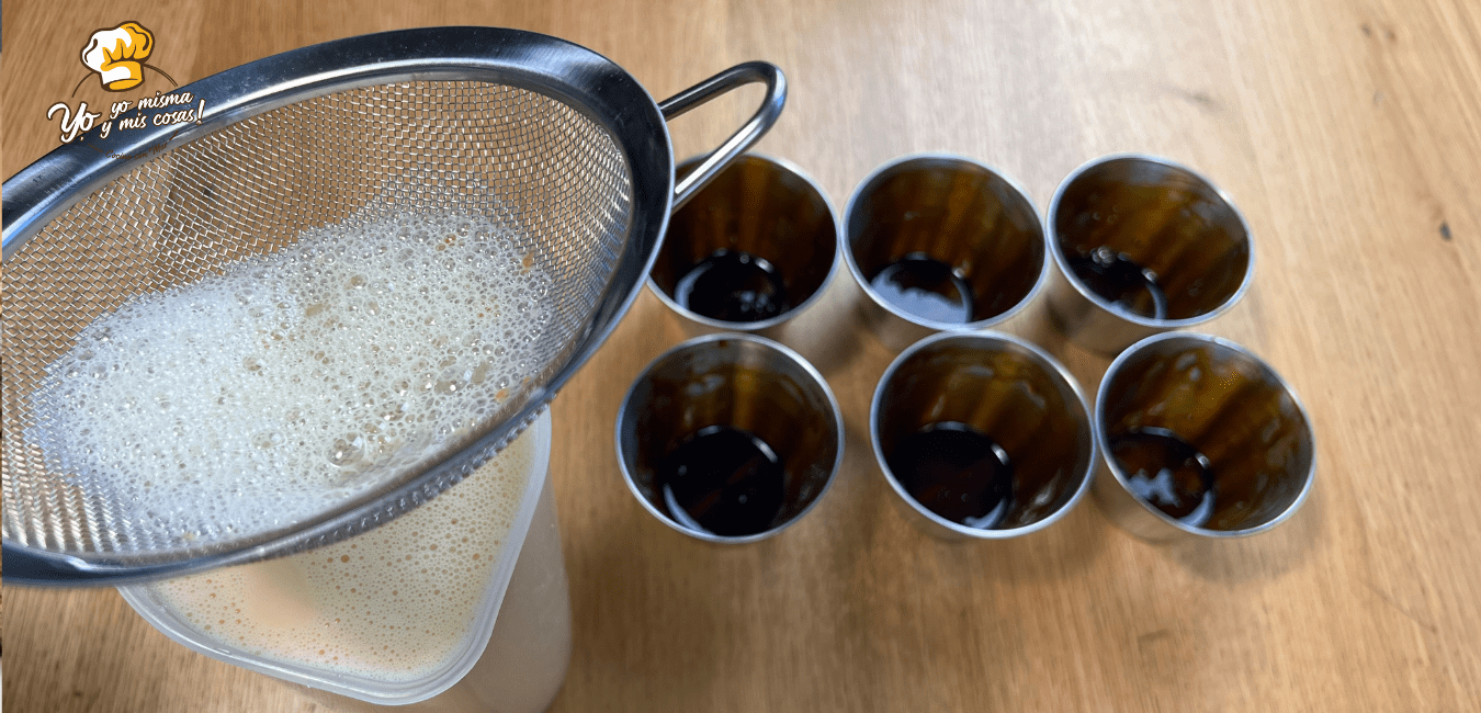 Vertemos la mezcla del flan de vainilla en los moldes caramelizados. He usado caramelo comprado.