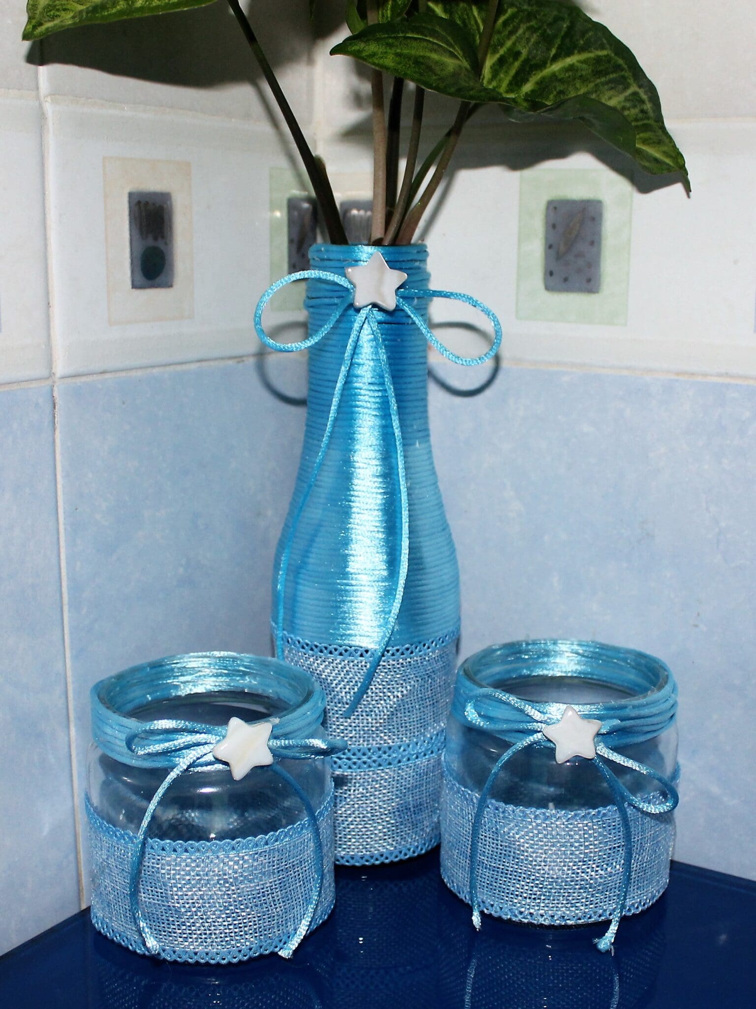 Hoy vamos a reciclar unos tarros y una botellita de cristal. Vamos a convertirlos en un bonito florero y porta velas preciosos. Mi baño necesitaba de este adorno. Ha quedado magnifico, le ha dado otro toque a mi mueble de lavabo. A continuación os detallo los materiales y las fotos paso a paso de todo el tutorial.