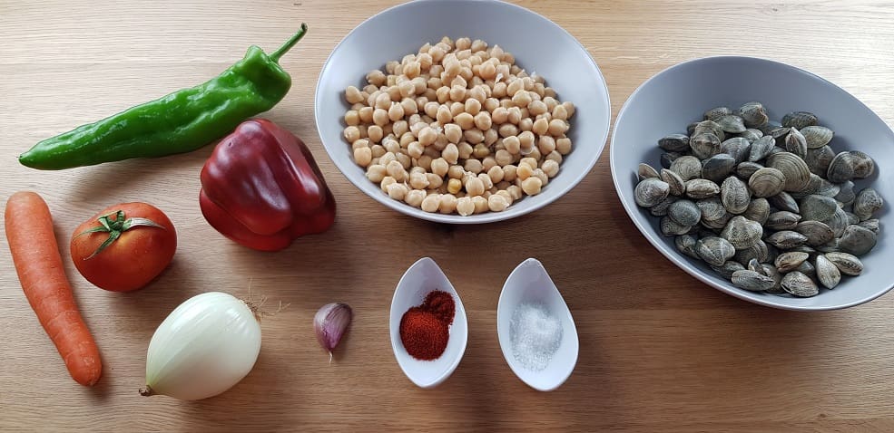 Aqui os dejo los ingredientes y su elaboración al completo. Vamos a la cocina a preparar estos garbanzos con almejas