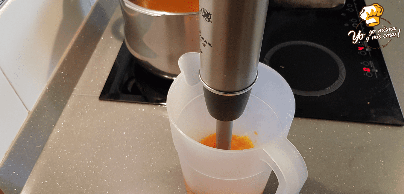 Abrimos la olla y retiramos en una jarra la cebolla, el pimiento, la zanahoria, los dos dientes de ajo y algunos trozos de la calabaza. Trituramos todo con la batidora.
