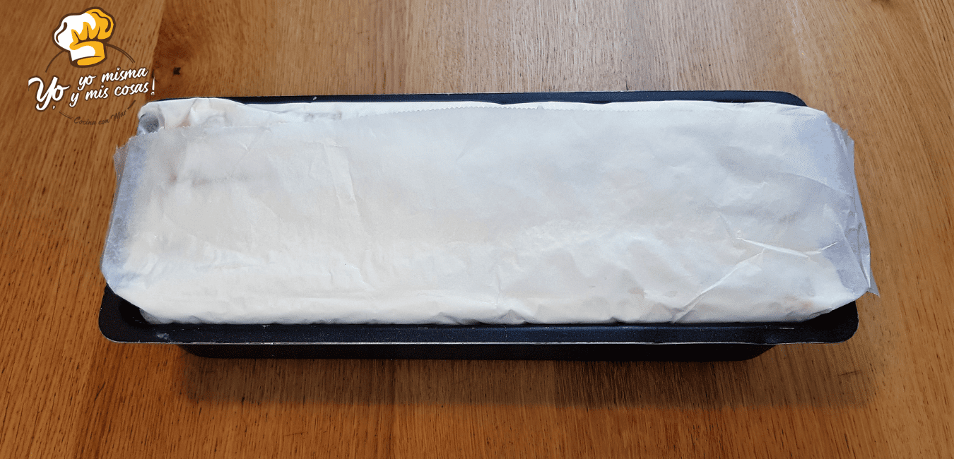 Voy a colocar uno de los papeles de hornear que he utilizado y lo voy adaptar al recipiente. Así desmoldaremos con facilidad luego.