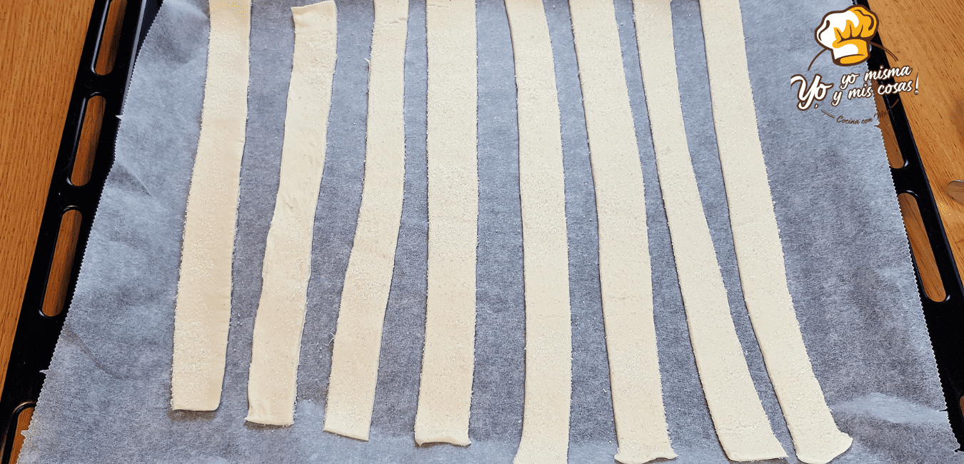 Ahora separamos las tiras y las colocamos sobre papel de hornear sobre la bandeja del horno.