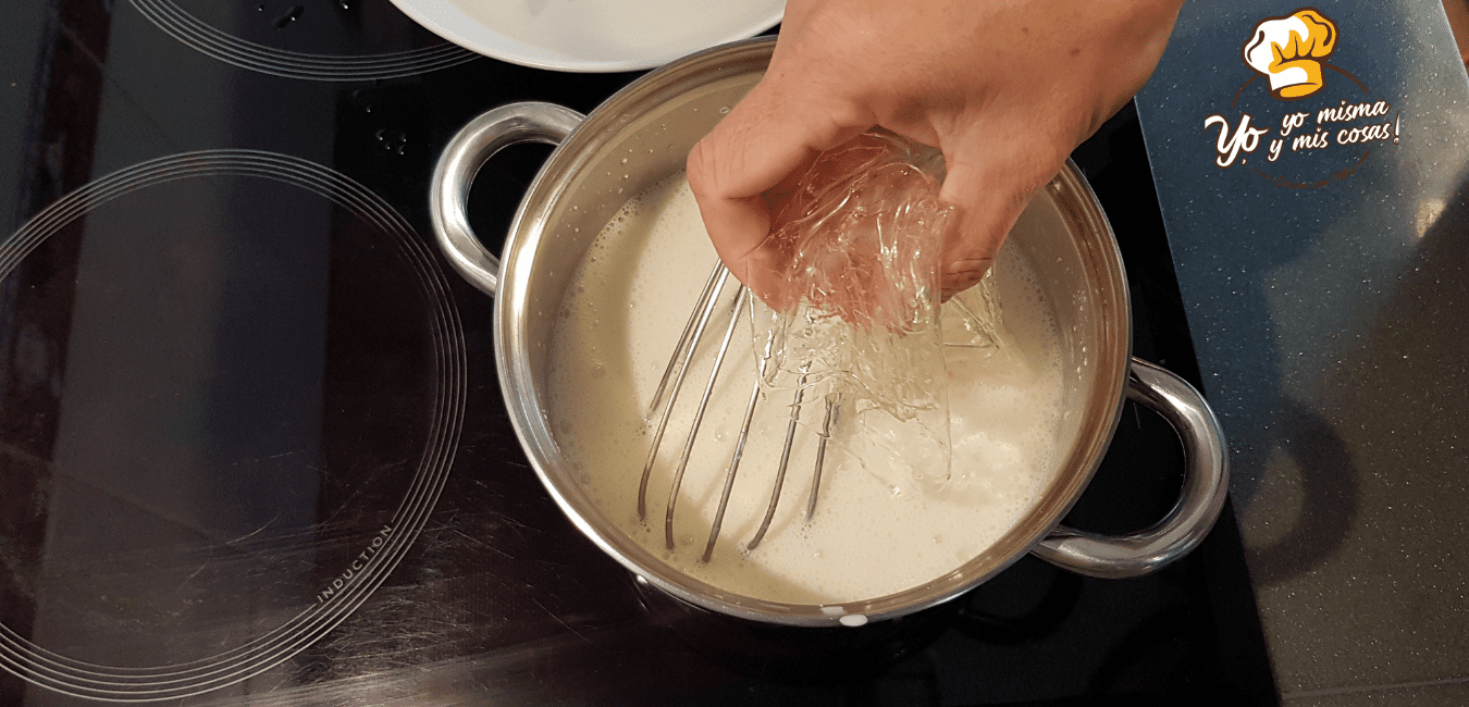 Cuando tengamos la leche caliente añadimos la gelatina escurrida y mezclamos hasta disolver por completo.