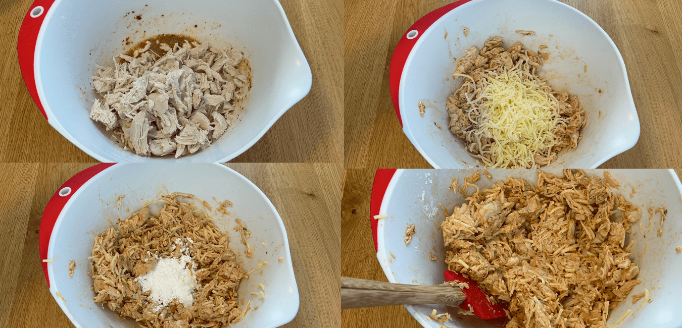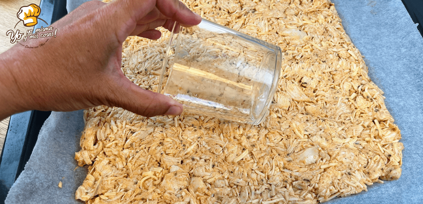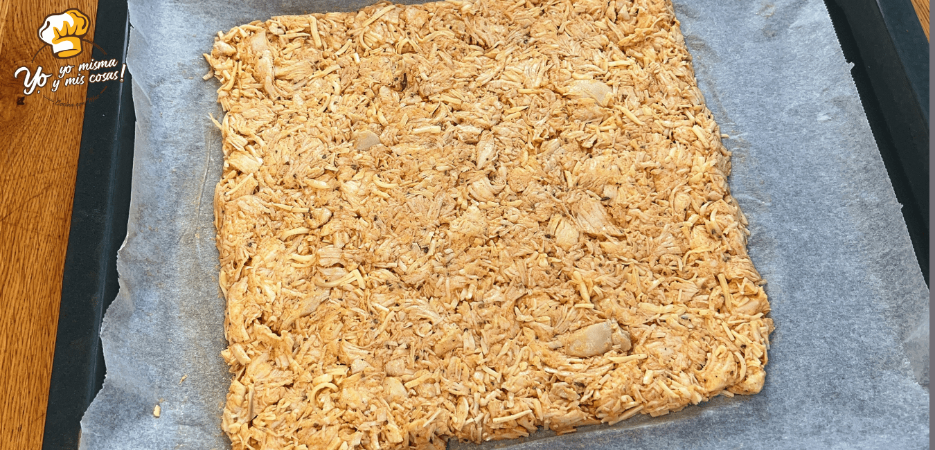 En una bandeja de horno colocamos un papel de hornear y echamos la mezcla de pollo.