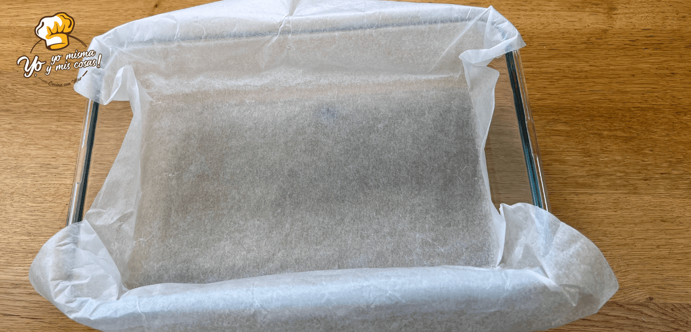 Voy a poner un recipiente que mide 30 cm de largo por 20 cm de ancho. Con un papel de hornear. También podéis engrasar con mantequilla.