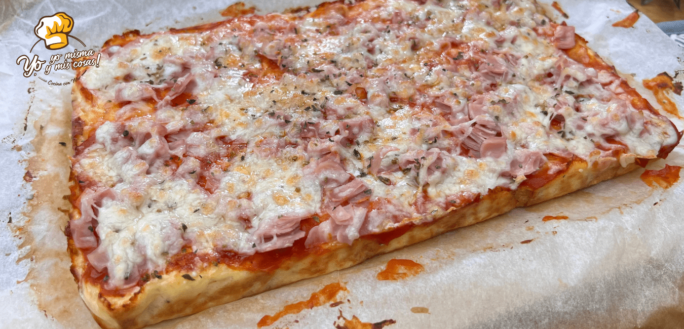 Cortamos el jamón cocido y lo añadimos. Echamos el resto de queso rallado y un poco de oregano.
