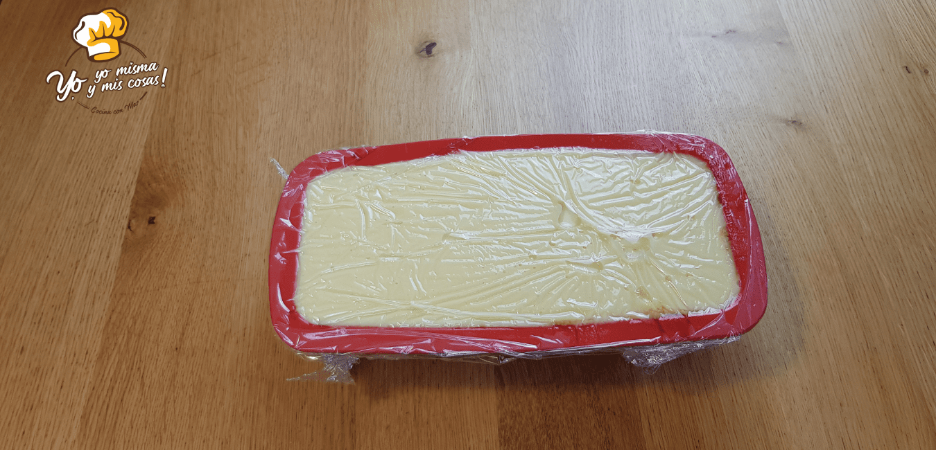 Vertemos la mezcla en el recipiente caramelizado y dejamos enfriar un poco a temperatura ambiente. Le colocamos un film transparente por encima para asi evitar que se vaya a crear una capa mas fea por arriba.