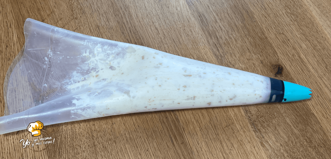 Voy a echar la crema directamente en la manga pastelera, y le voy a poner una boquilla ancha. Para que después salga bien la crema con los trozos del turrón.