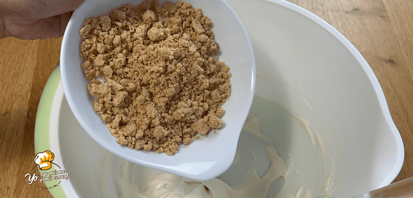 Troceamos el turrón tierno de almendras y lo añadimos la crema. Mezclamos con una espátula.