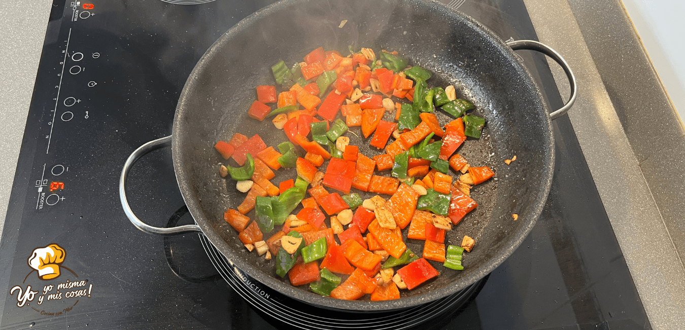 A un fuego medio vamos a cocinar los dientes de ajo pelados y laminados. Y los pimientos troceados.