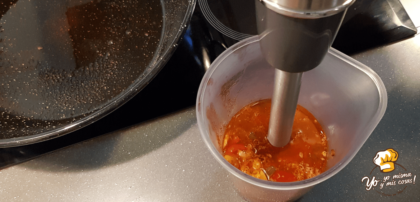 Ahora vamos a triturar todo con la batidora en una jarra o vaso de batidora. Añadimos unos dos dedos de caldo de carne para mejorar el triturado y cueste menos.