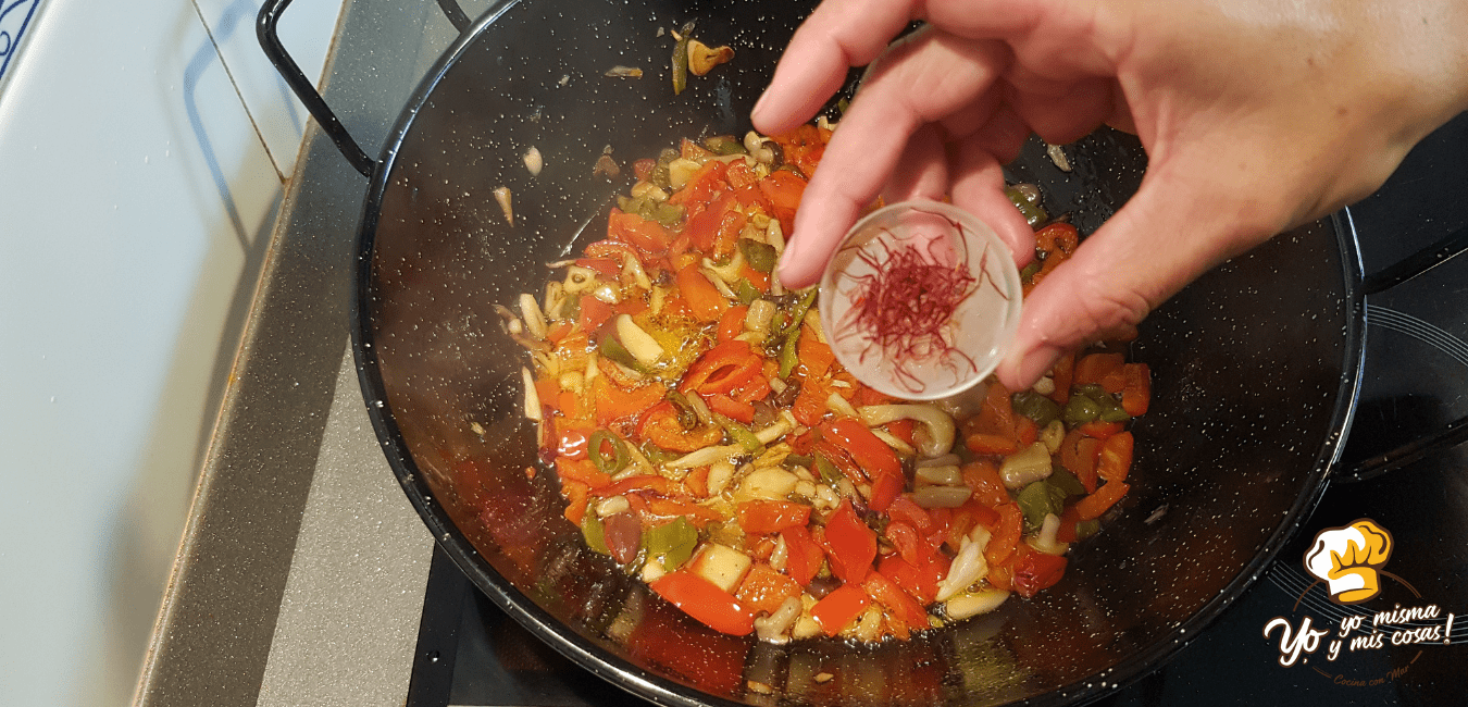 En ese momento retiramos las hojas de laurel, añadimos las hebras de azafrán y mezclamos.