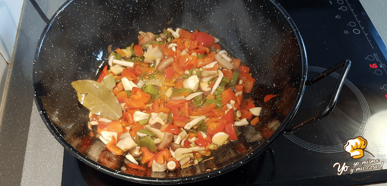 Vamos a cocinar a un fuego medio, numero 6 de mi placa de inducción, hasta que estén los pimientos comenzando a estar tiernos.
