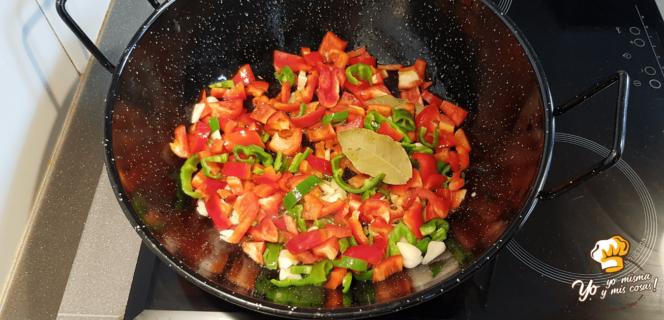 En una cazuela o sarten o paellera añadimos aceite hasta cubrir el fondo y añadimos los dientes de ajo troceados, los pimientos troceados y las dos hojas de laurel.