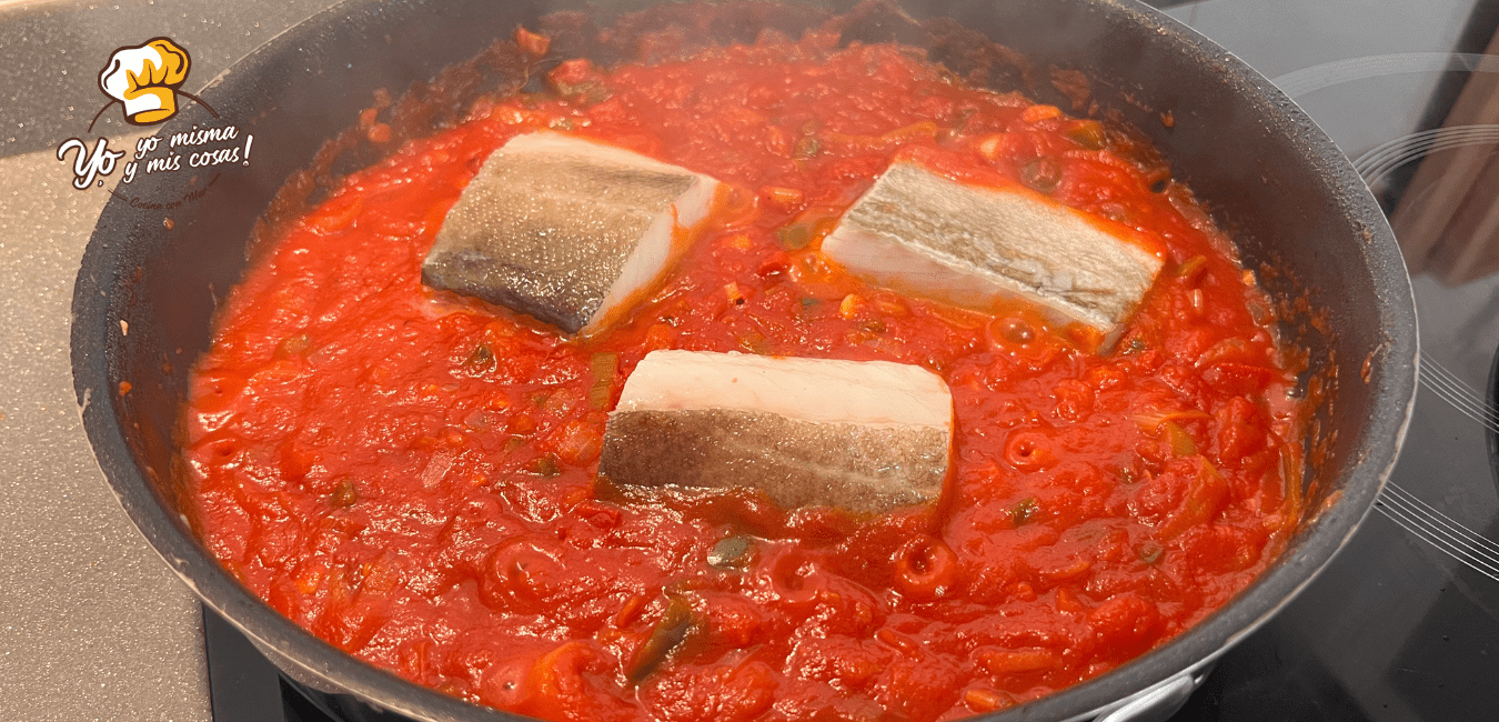 Una vez la salsa lista añadimos el bacalao. Lo colocamos con la piel hacia arriba primero. A fuego medio y con tapadera a medio colocar cocinamos 4 minutos.