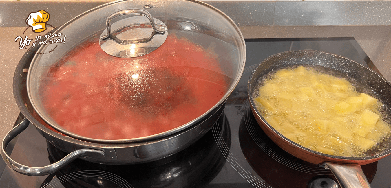 Cocinar hasta que veamos la salsa de tomate lista. Cuando tome un color anaranjado. Yo la tuve unos 15 minutos al fuego. Mientras estuve friendo las patatas en otra sartén con aceite y corté las patatas en dados.