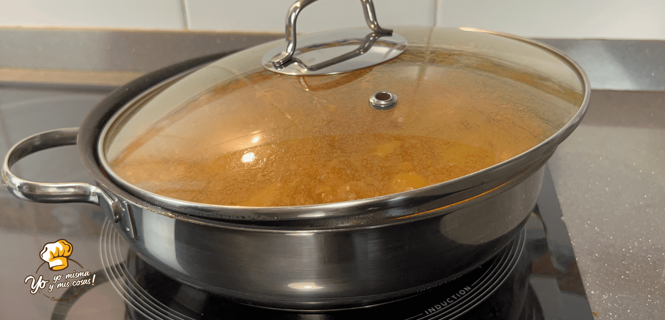Colocamos una tapadera a medio poner y cocinamos hasta que las patatas estén listas. Aproximadamente unos 20 a 25.