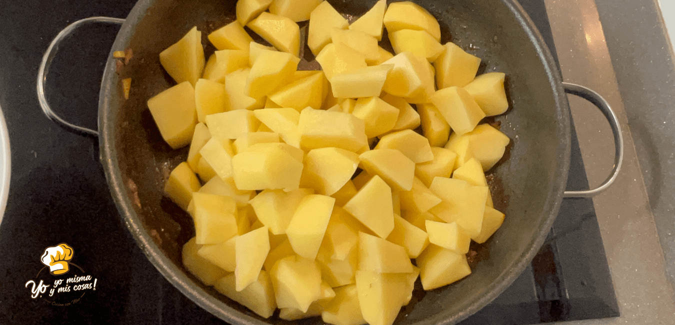 En la misma cazuela añadimos las patatas peladas, lavadas y chascadas.