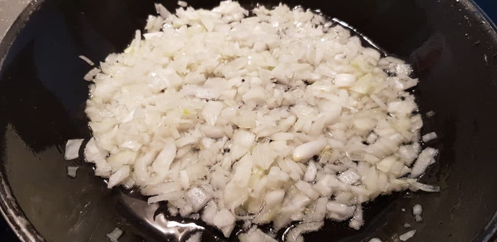 Vamos a poner una sartén un poco de aceite a calentar. Picamos la cebolla lo más pequeñita posible y empezamos a dorar.