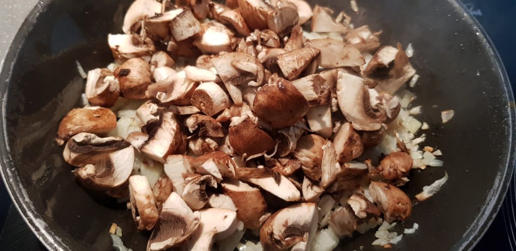 Limpiamos los champiñones y troceamos en trocitos. Añadimos en la sartén. Dejamos que vaya perdiendo su tamaño.