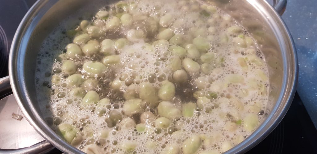 Lo primero que vamos a realizar es el relleno. Vamos a poner una olla con agua a calentar con un poco de sal. Vamos a echar las habas para cocerlas. Unos 8 minutos aproximadamente desde que empieza a hervir. Al terminar escurrimos.