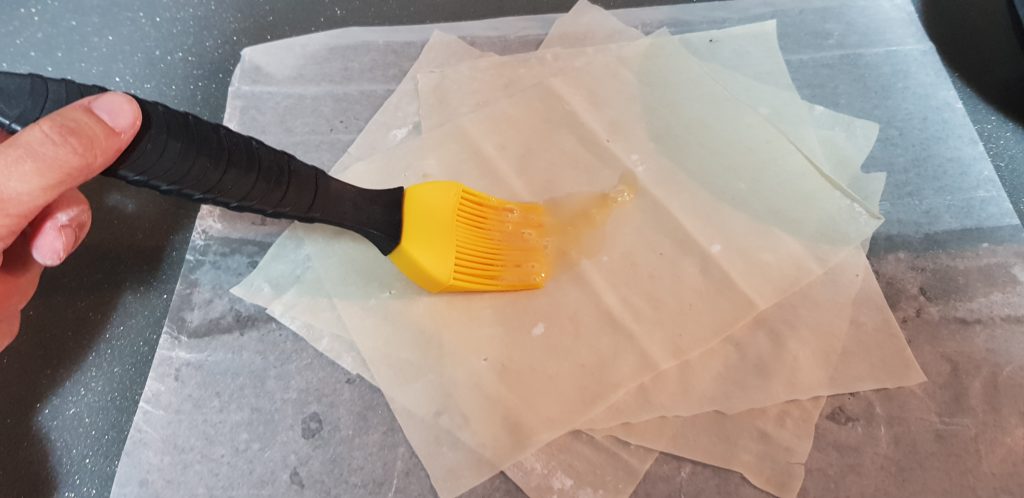 La masa filo hay que tratarla con delicadeza porque es muy frágil. Se rompe con nada. Una hoja de masa filo la vamos a cortar en cuatro. Yo he puesto las cuatro partes que he cortado pero os hago el cambio por el resultado. Ponéis solo 3 cuadrados y los colocáis que no coincidan las esquinas. Para que se vayan uniendo entre si las capas vamos a pintar con huevo batido.