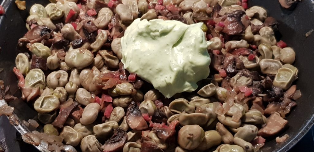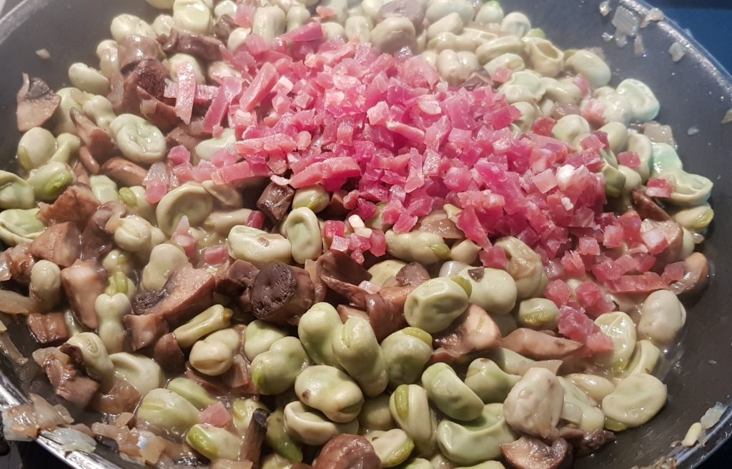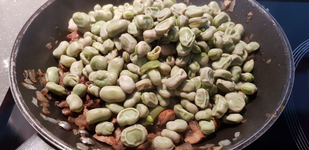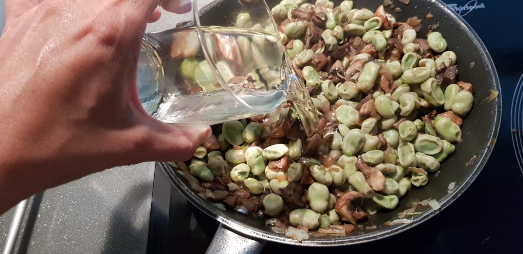 Cuando los champiñones pierdan su tamaño y la cebolla esté doradita, añadimos las habas cocidas y el medio vaso de vino blanco.