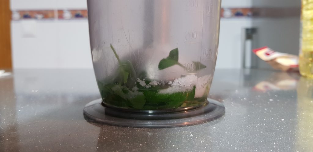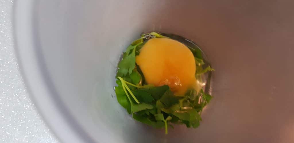 Vamos a coger el vaso de la batidora y vamos a echar el huevo, el perejil, un poco de sal y el trocito de ajo. Batimos todos los ingredientes.