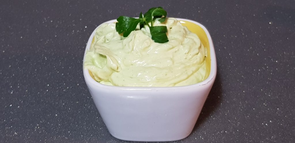 Ya tenemos nuestra mayonesa aromatizada con ajo y perejil. Queda buenísima. Os la recomiendo como fondo en bocadillos con filetitos, quedan mucho más jugosos y buenísimos.