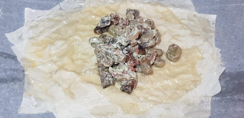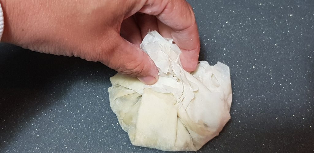 Una vez tenemos las tres capas preparadas vamos a echar relleno justo en medio y cerramos cogiendo los extremos, apretamos suavemente. Si tenéis cebollino podéis liar uno alrededor. Yo no tenía y apreté un poco y quedo fenomenal. Pintamos con el huevo y cuando tengamos todos los saquitos llevamos al horno