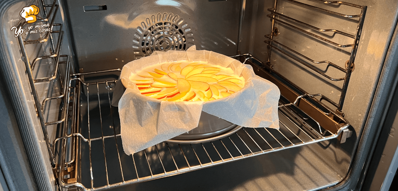 - El recipiente que he usado mide 24 cm de diámetro, con un papel de horno adaptado.