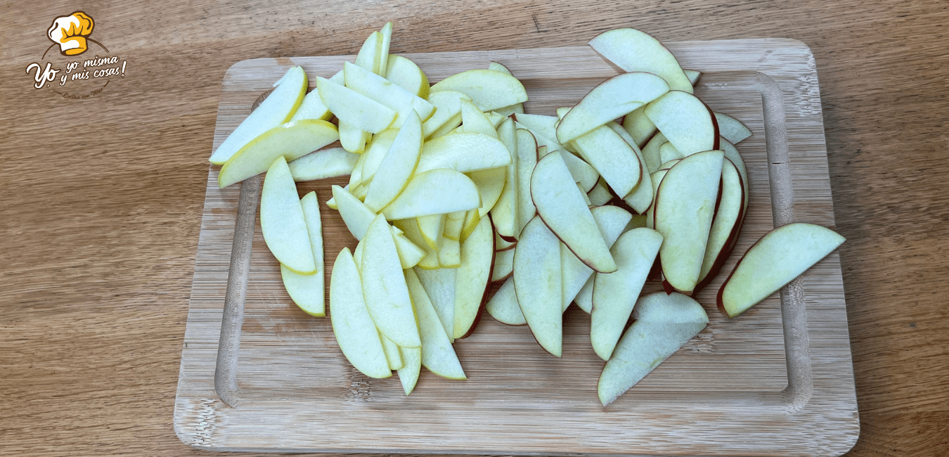 Cortamos las otras dos manzanas en finas laminas. Para la decoración he usado una manzana Golden y otra roja, reineta. Le he dejado la piel, pero se la podéis quitar.