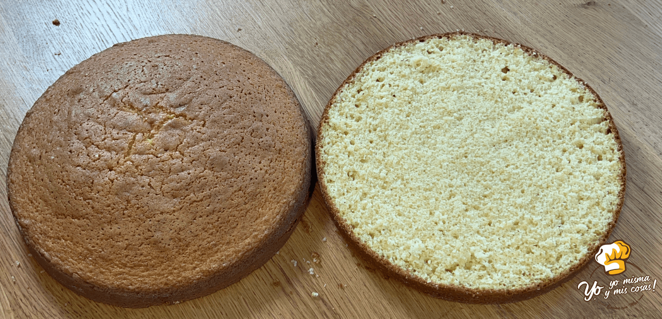 Una vez esté completamente frio vamos a cortar por la mitad el bizcocho.