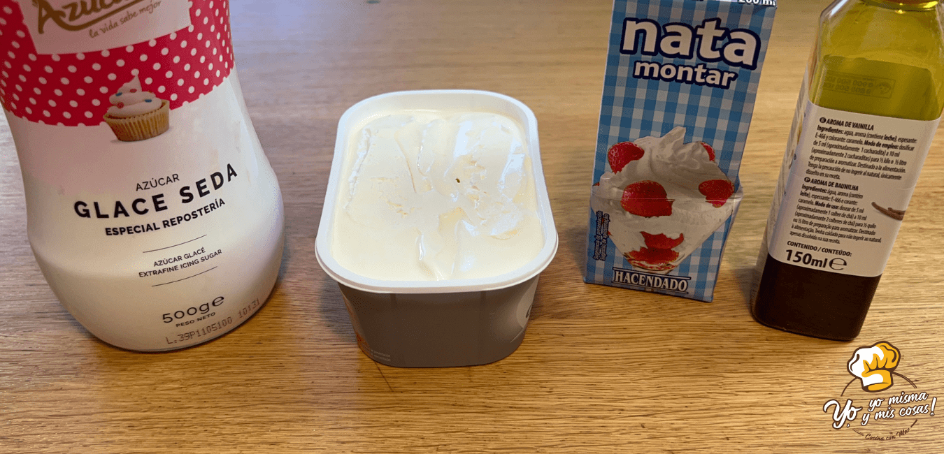 En un cuenco o recipiente echamos la nata para montar o crema de leche para batir, la esencia de vainilla, el azúcar y el queso crema.