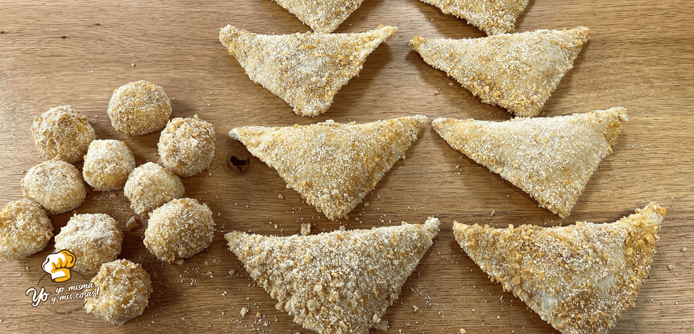 Pasamos los triángulos por huevo batido y luego por el pan rallado mezclado con los corn flakes.