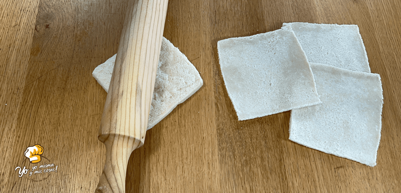 Con un rodillo o vaso vamos a extender, aplastar el pan de molde.