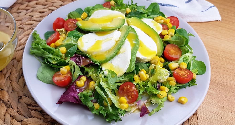 La ensalada que yo he preparado es mezcla de hojas verdes, mozzarella, cherrys, maíz